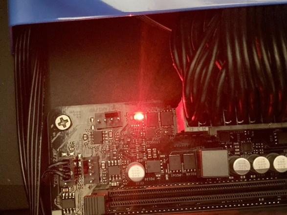 ・・・やはり何も画面に映らない。 うーん、グラボが壊れたとは思えないが、念のため内蔵GPUで起動してみるか、とグラボを抜いた状態でマザーのHDMIに繋いで起動、やはり映らない。 (よく考えたらこれは当然だった、今どきの内蔵GPUはマザーではなくCPU内にあって、あまつさえ自分のCPUはGPUレスだった) 一体、何が原因なのだ? ふと起動中のマザーボードを見ると赤いLEDが点灯していました。