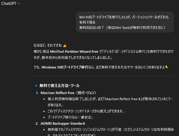OS再インストールなしでブートドライブを交換するにはWindowsだけでは出来ないので、社外アプリが必要です。 (Win2000の頃は無理くりコマンドプロンプトだけでやったこともあるけど) 過去に2度ほど使った「Mini Tools」というアプリが無料で簡単で安全だったので今回も使用予定だったのですが、なんと現在のバージョンは有料。 30日の無料期間等もなく、いきなり月額数千円はちょっといやらしい。 数年に1回使うかどうかというアプリに払うのはなあ・・・。 と思っていろいろ探すも他のアプリも大抵同様のプランで、オープンソースのアプリくらいしか完全無料はない。 オープンソースのはCUIだったりでちょっと操作がややこしくハードルが高いので、ChatGPTに無料のGUIで使える完全無料はないのか聞いてみたところ、「Macrium Reflect free 8」というのが非商用なら無料らしい。 但し、最新バージョン(有料のReflect 8.1)のリリースと共にこちらも配布は終了しているが、ミラーサイトが残っているとのこと。 そんなことまでChatGPTは知っているのか、スゴイ。