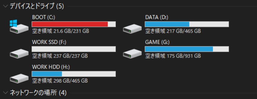 | ウチのWindows10 PCさん(Win11はいろいろ信用ならんのでまだアップデートしない)ですが、データドライブはいろいろと追加していて、 古いのも合わせて現在4ドライブ(SSD3個+HDD1個)でさらに外部にNASドライブもありますが、ついにCドライブがいっぱいになってしまいました。