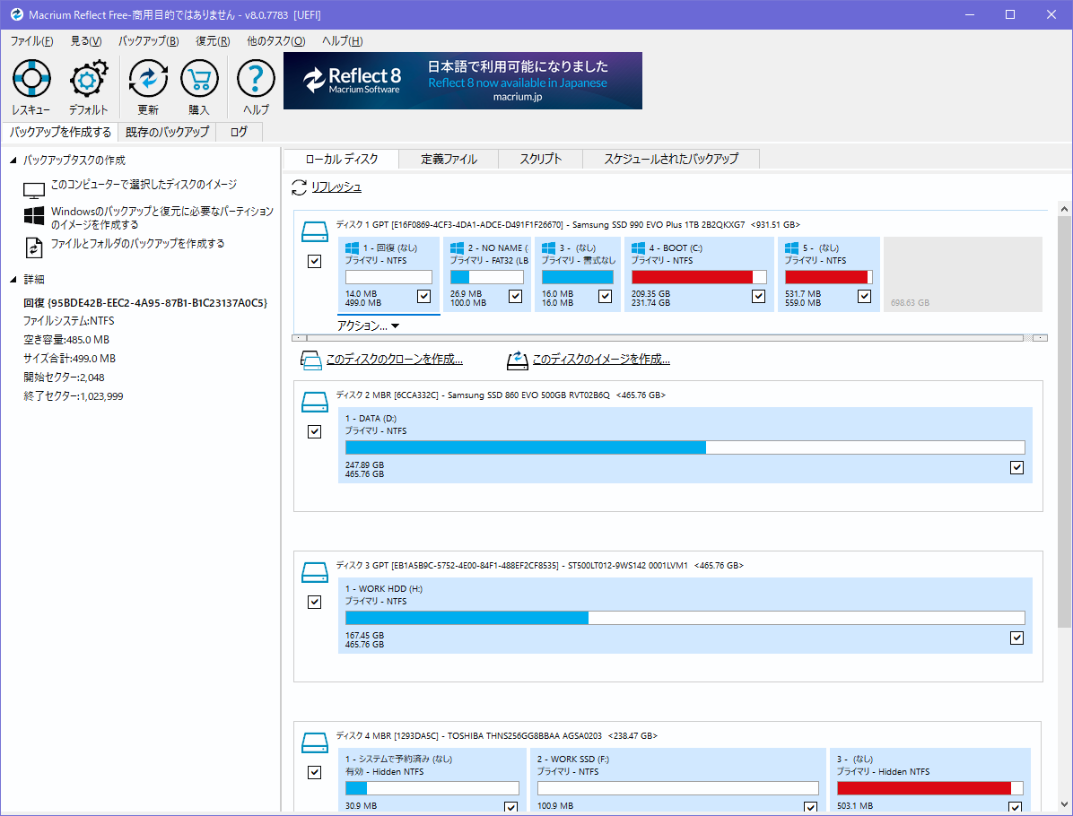 ブートドライブの容量を見たところ、なぜか1TBではなく256GBのまま。 うーむ、256GBのドライブは抜いたはずだが。 Macrium Reflectで表示してみると原因が分かりました。 256GBのクローンを作成したので、そのまま、256GBのサイズでクローンしてたのです。 なるほど、クローンってそういうことになるのか〜、今までは同容量のドライブに交換してただけなので気づかんかった。 まあでもパーティションツールで簡単にサイズ変えれるやろ、と思いましたがそうは問屋が卸しませんでした。