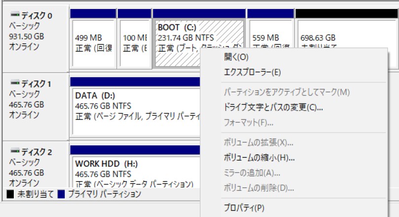ググってみると、今どきは社外のパーティションツールを使わずとも、Windowsの機能で動的にパーティションサイズを変えられるらしい。 ディスクの管理画面でブートパーティションのコンテキストメニューにある「ボリュームの拡張」をすれば良いみたいですが、自分のブートパーティションではなぜか「ボリュームの縮小」しか選択できない。 これもググってみると、どうやらすぐ隣に「回復パーティション」があるかららしい。 これを削除すれば「ボリュームの拡張」が出来るようですが、これはディスクの管理画面では出来ずコマンドプロンプトが必要。 まあ書いてあるコマンド打つだけだしと思い、ちまちまやってみました。