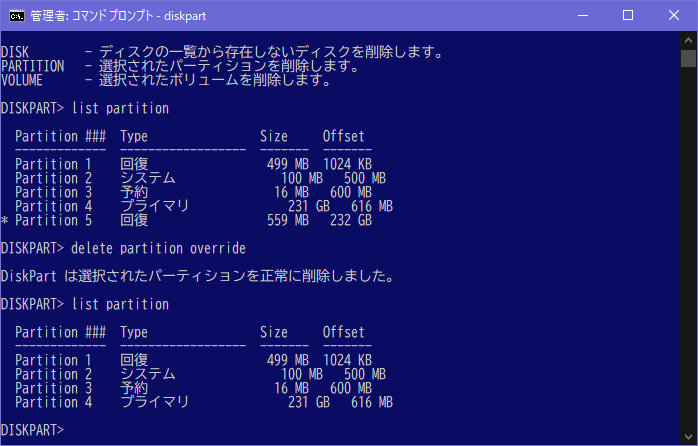 1.コマンドプロンプトで「diskpart」→ diskpart.exeが起動 2.「list disk」→ 回復パーティションのあるディスクを表示 3.「select disk (対象の番号)」→ 対象のディスクが選択される 4.「list partition」→ 選択したディスクのパーティションを表示 5.「select partition (対象の番号)」→ 対象のパーティションが選択される 6.「delete partition override」→ 選択したパーティションを削除