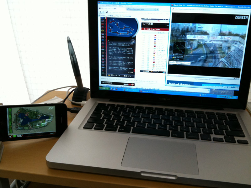 が、決勝レース2時間前に見つけたこのサイトは、Proxyなどなしに超フツーに観れちゃって拍子抜け。 14:55に表示してたウィンドウで勝手に始まって、ほぼリアルタイムの映像で観戦出来てしまいました。(もちろん実況・解説は英語だしSD画質だけど) という訳でこれが今日の観戦スタイル。