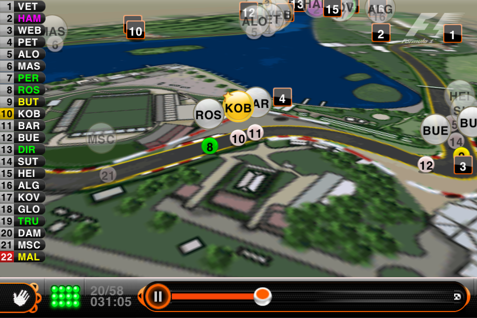 予選で、「前が空いてるタイミングでアタックに入れそうだ」とか、決勝でどのドライバーと接戦してるとか、如実に分かっちゃいます。 残念ながら英語ですが、一応リアルタイムのコメントも見れます。(誰が何のトラブルで止まったとか、ペナルティ食らったとか) しかもタイミング情報を保存できるので、あとでリプレイすることも可能。 ま、月額に直せば315円くらいな訳で、さほど高くないじゃん、と予選前にポチりました。 おかげで予選の観戦は、このアプリとYahoo!の日本語コメントで、なかなか状況が良く分かって楽しめました。 可夢偉も、余裕でQ3進出して9番手スタートをゲットしたしね!