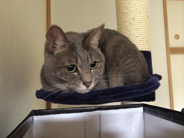 去年キャットタワーを新調した当初は、自分で登ることもなく、乗せても嫌がってすぐ降りてしまっていたのに、なんで今さら快適なことに気づいたのか。 とにかく、日中はよくここでくつろいでいます。 下僕どもの様子がよく見えていいのでしょうかな。