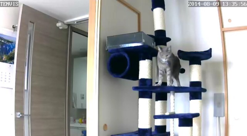 iPhoneからボタンひとつで静止画や動画も撮れるし、音を聞いたりこっちの音をカメラから出したり(つまり通話)も可能。 あまつさえ、さほど期待していなかった暗視モードが意外にも使える。 明度センサーが閾値を超えると自動で赤外線LEDが点灯し、暗視モード(モノクロ)に。 見た目はLEDがぼんやり赤色に光っているだけですが、実際の映像はこのとおり、ネコの目が反射するくらいハッキリ写っています。(もちろん真っ暗闇です)