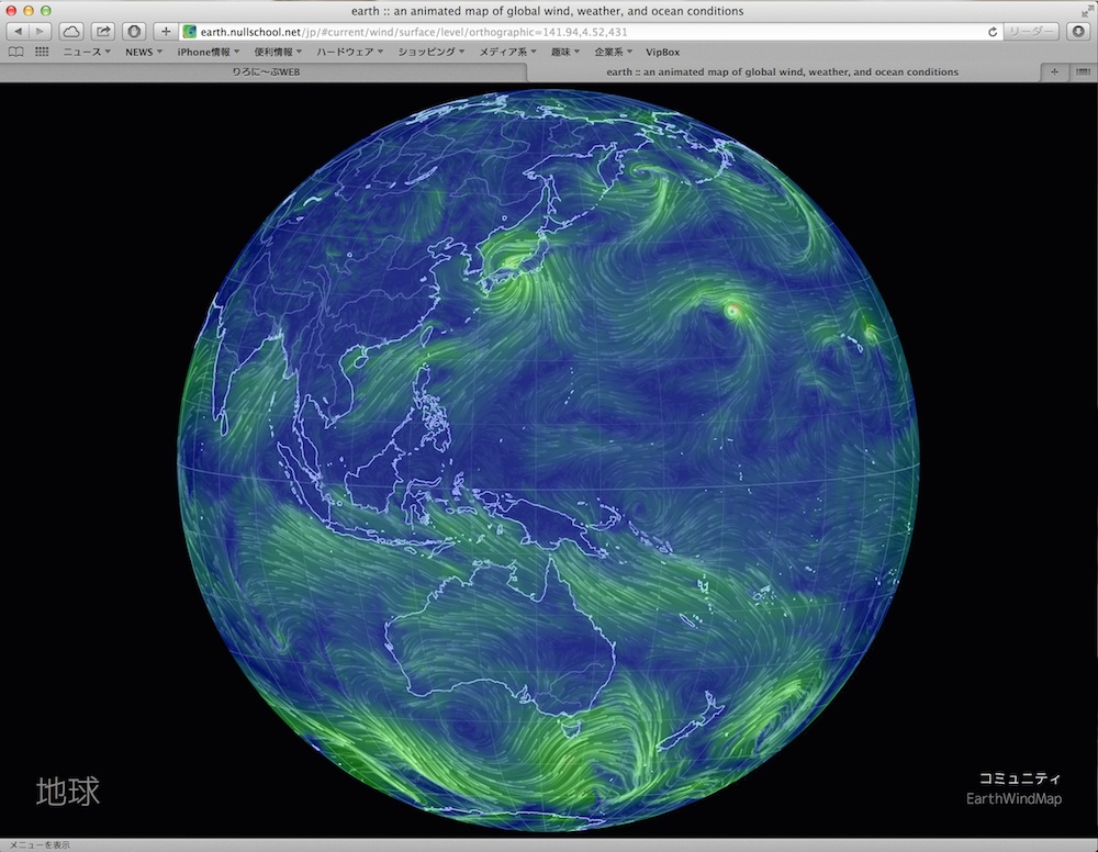 地球全土の大気の流れ??が分かるらしきアプリで、アニメーションで風が流れてて分かりやすいのと、日本近辺以外もすべて見れてオモシロイ。 試しにいま来ている台風11号の動きを観察していましたが、台風情報の現在位置とまあまあズレなく表示していて、精度も高いようです。 | | | | |