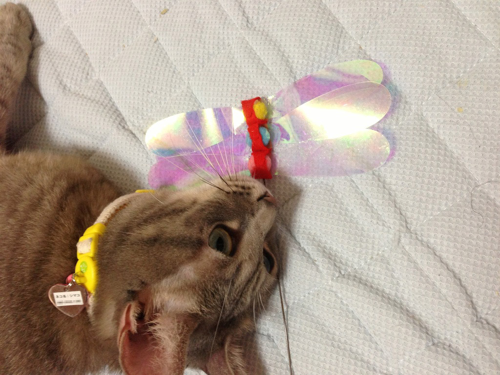 羽がキラキラしてて、動きがトリッキーなのでかなり興奮するようです。