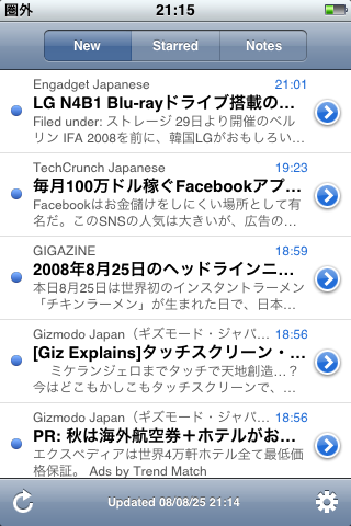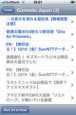 ●RSSフィードリーダ「NetNewsWire」(無料) RSSリーダもかなりの数がリリースされているのですが、このアプリは最初期にリリースされたものです。 いくつか他の類似アプリも試しましたが(450円もする「Byline」も)、結局これが一番気に入ってます。 理由は、フィード登録方法とカテゴリ分けが出来る点です。 フィード登録はNewsGatorサイトでユーザー登録をして、PCから登録を行なうのですが、 LiveDoor等のリーダーサイトと比べると結構サクサク出来るのです。 しかもGoogleリーダーやLiveDoorでは、登録したフィード名が変更出来ない(元サイトの名称そのまま)のに対し、 NewsGatorでは変更出来たり、結構融通が利きます。 (名称変更は、長過ぎてiPhoneの画面では切れてしまうサイト名を短くしたり、Yahoo!Pipesを経由した場合などに便利) さらに、カテゴリ分けは他のリーダーサイトでも出来るものの、それらのiPhone用リーダーアプリでは反映されず、ごっちゃになって表示されてしまうのですが、 NetNewsWireではちゃんとカテゴリごと、サイトごとにフィードが表示されるので、 「同一カテゴリのサイトは並べて表示させたいけど、フィードはサイト単位で見たい」ボクの要望に見事合致しています。