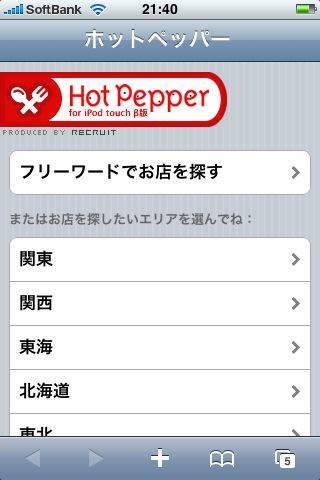 さらにスゴイのを見つけました。 おなじみ「ホットペッパー」がiPhone用(というかiPod Touch用)のWebアプリを作ってました。