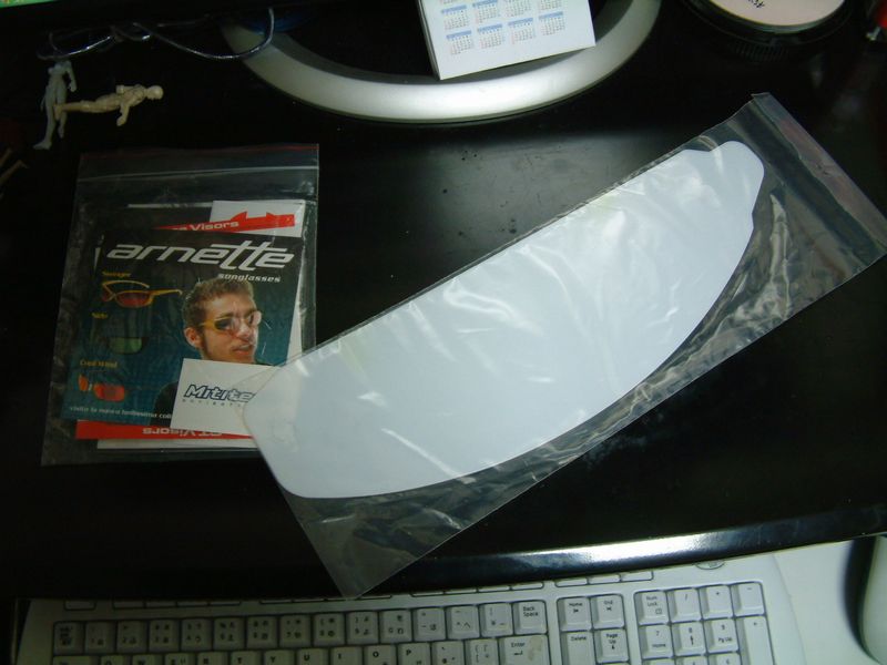 捨てバイザーとは何かと申しますと、 GPライダーやF1ドライバーのヘルメットのシールドの上から貼り付けるフィルム状のクリアシートで、 前方を走るマシンからのオイルや、タイヤかすなどの汚れが付着して視界が悪くなったときに、 ペラッと一枚剥がすことで視界を即座に回復できるという便利グッズです。