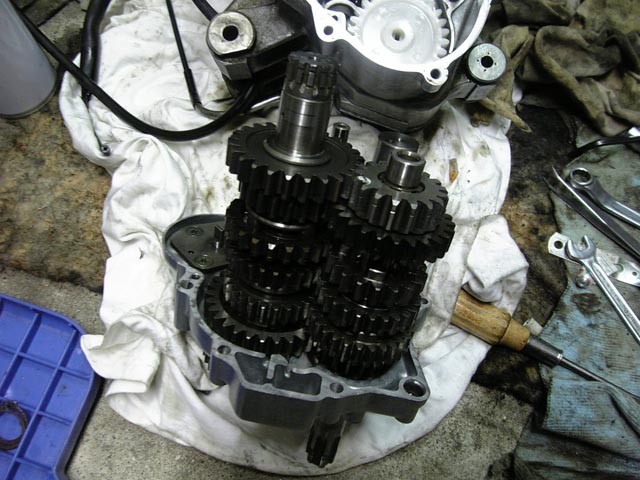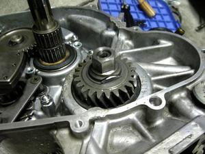 湿式クラッチを外したら、ノーマルのミッションもさっと外し、まずはクロスミッションの組み付け。