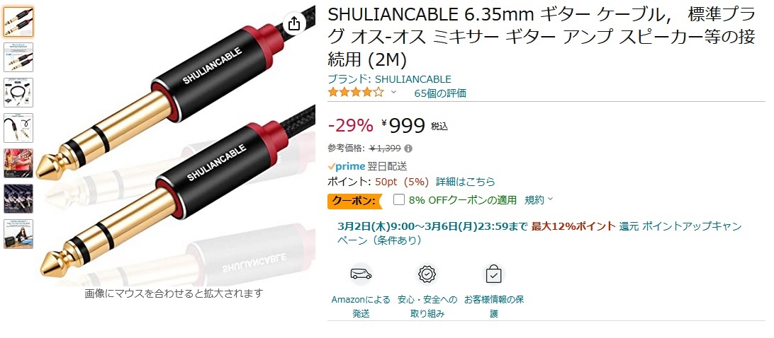 本体と一緒にテキトーな中華製ケーブル(900円程度だが一応ギターケーブルと書いてある)も買いました。