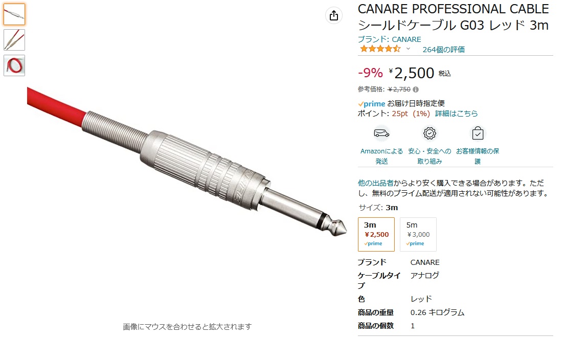 やむなく、ちゃんとしたギター用シールドケーブル(日本製)を買い直しました。2.5倍の2500円で。
