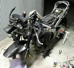 で、せっかくハンドルバーとかディスクとか必要なパーツがだいたい揃っているので、フロント周りを進めてしまおうかと思い、 弟がヒマしてたのでガレージに連れ出して手伝ってもらい、バラし始めました。