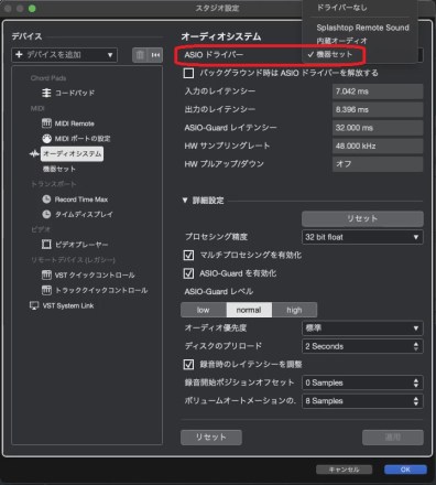 その上で、Cubaseを立ち上げ直してスタジオ設定から、ASIOドライバとしてこの機器セットを選択、機器セットのプロパティ画面で入出力ともにチェックを入れると利用できるようになります。 こうしてやっとマイク音量とイヤフォン音量を別々に操作できるようになりました。そしてUSBマイクを捨てなくて済んだ。良かった。