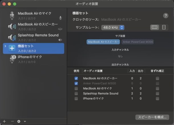 MacOSには「Audio MIDI設定」というツールがあり、ここでオーディオ入出力機器の組み合わせを手動で作れるのです。 具体的に言うと、入力はUSBマイクから、出力はMacBookのスピーカー/イヤフォン端子からにしたいならば、設定画面で「機器セットの追加」をクリックし、希望の入出力機器をそれぞれ選択して仮想オーディオインターフェースを作成する感じです。