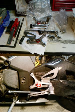 さて、早速取り付けるためにそのままガレージへ直行。 ちなみにアグスタのノーマルステップは悪くはないものの、削り出しではなく鋳物で安っぽいし、濡れると滑る。 その上、長年の使用で塗装が剥げたり、汚れが落ちなくなったりでカッコ悪くなったわけ。