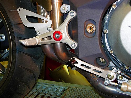 さっさとノーマルを外してMR製を付け始めたのだが・・・ペダル類に難が・・・ 左のシフトリンクロッドが若干長すぎで、ペダルがイイ位置に来てくれない。 しかも右のシフトペダルはもっと深刻で、ノーマルと同じ位置に固定するとペダルの先がフレームに接触・・・ΣΣ(゚Д゚;) カラーか何かで3mmくらい外にオフセットすれば問題ないが、そんなカラーなぞ付いてない・・・ テキトーなワッシャーを探したが、結構径の大きいボルトなので合うワッシャーもなく、やむを得ず、転がっていた1mm厚のアルミ板を切って作ることに。 ところが、せっかく作った自作カラーがやはりショボくて、ボルトを締め付けるとペダルが動かな〜い(汗 後日ちゃんとしたカラーを買ってこないとダメそうです。 何で付いてないんだ!