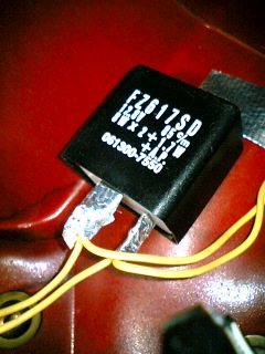 ていうか、メーカーの説明書やHPには、付属の「RESISTOR(抵抗)」をこのように付ける、みたいな書き方がしてあるのだが、コレはどー見てもフラッシャーリレーである。しかしなぜか、説明の通り付けてみると、速度が安定するのである。(謎) でも、1個しかないので両方の配線を写真のように繋げると、速度は問題ないのだが、反対側のウィンカーがときどきつられて光ってしまうのである。場合によるとハザード状態になってしまうのである。
