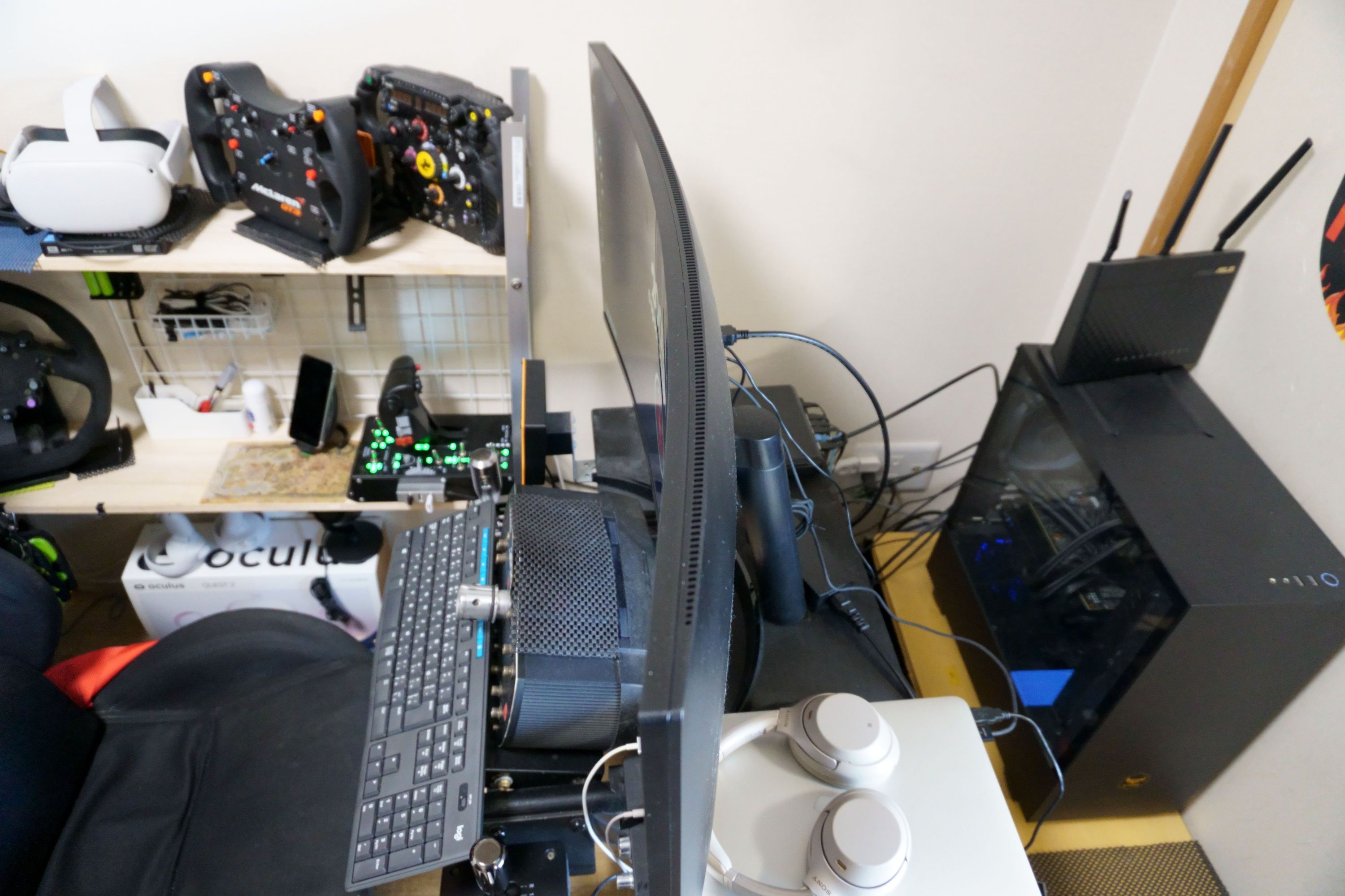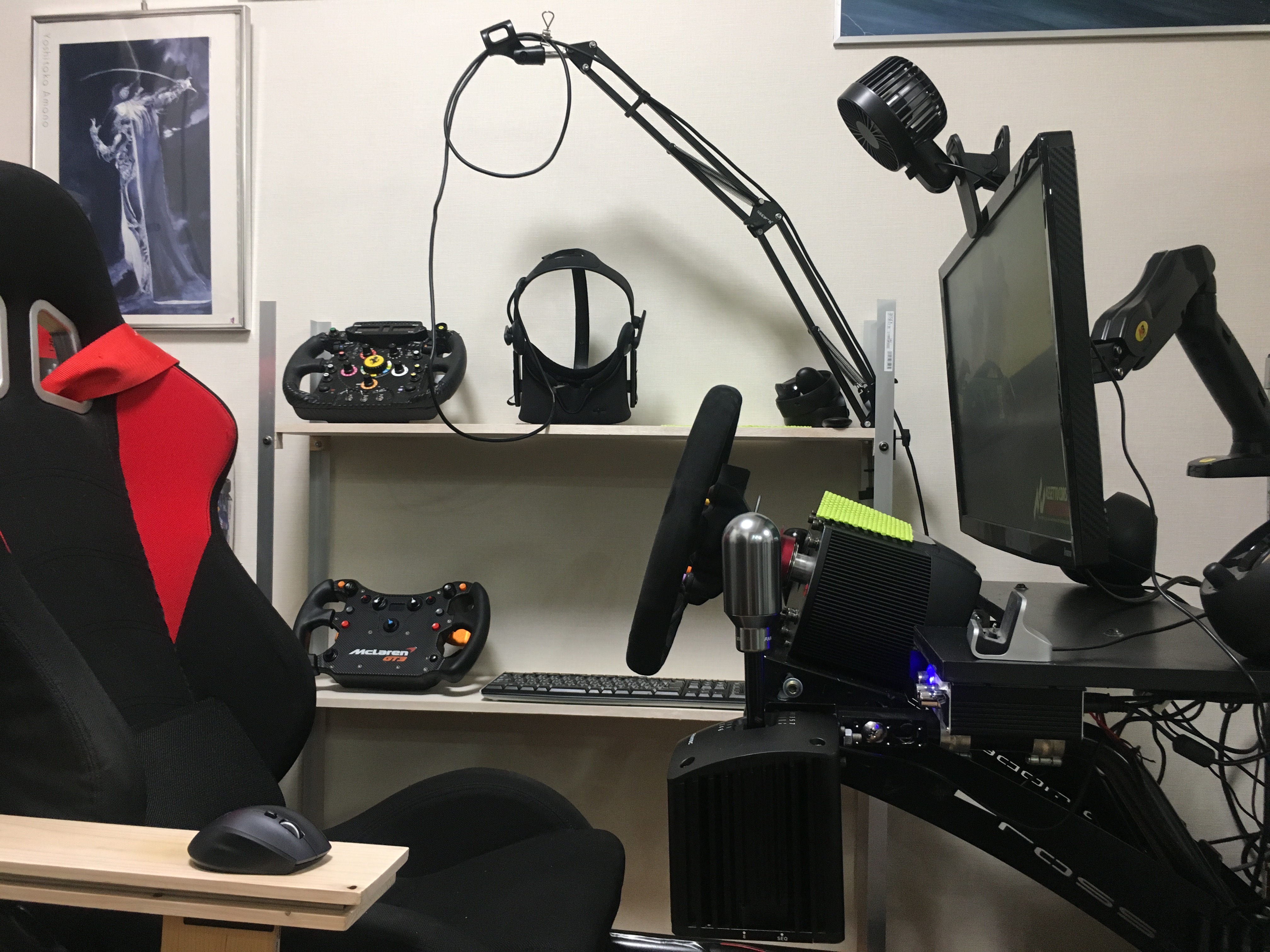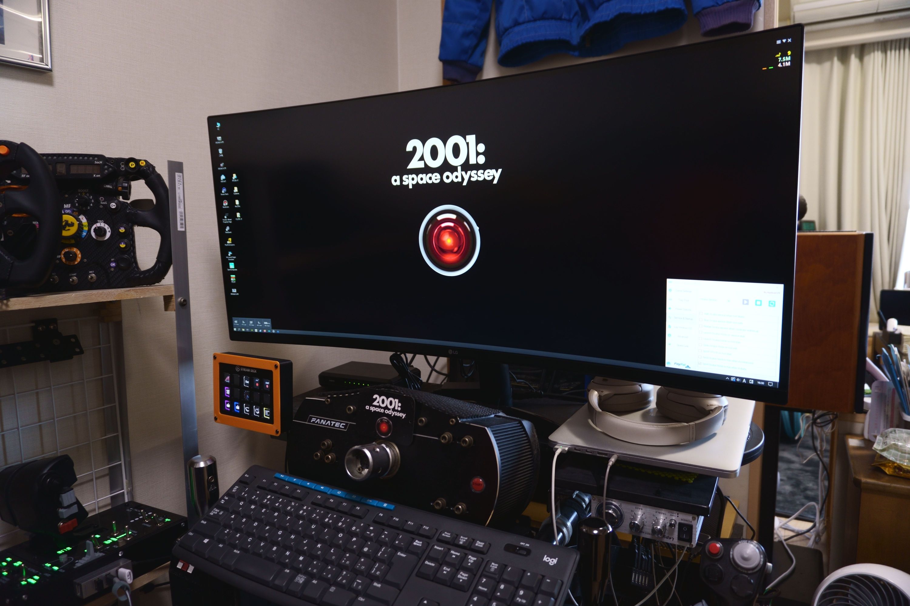 LGの34インチ3440x1440(UWQHDだっけ?)の液晶のヤツです。 狭いコクピットにこれまでの24インチでもギリギリだったのに、34インチなんか設置できるのかと思いましたが、まあなんとか置けました。 ただし、これまで使っていたVESAのモニターアームに付けてみたら重すぎて支えられなかったので、やむなく付属のスタンド固定にします。 なんせこれまたタイムセールで購入した3500円くらいの超安物モニターアームだった(それも5〜6年前)ので、34インチは規格オーバーの模様。 まあLGのスタンドは昔からあまり邪魔にならないデザインで、ちょうどハンコンベースを避ける形で設置出来たので、結果オーライ。 高さや向きが一切変えられないのが痛いですが、まあしょうがない。 いずれまた安くて34インチに対応してるモニターアームを見つけたら交換しようと思います。