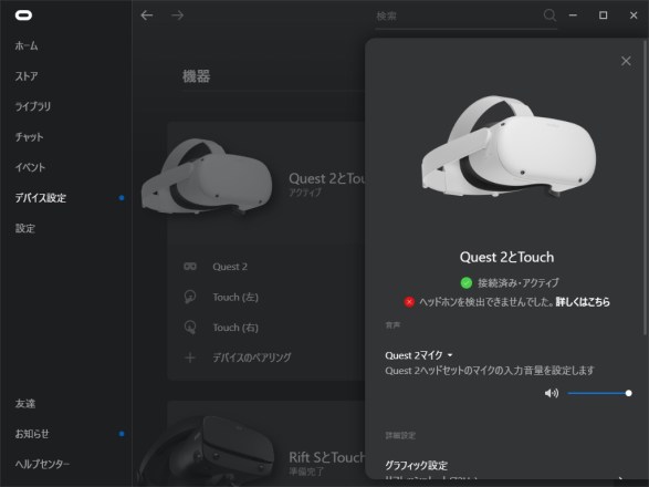 Oculus Home上でQuest2をAir LinkもしくはOculus Linkで繋ぐと「ヘッドホンを検出できません」となって音だけが出ない問題。