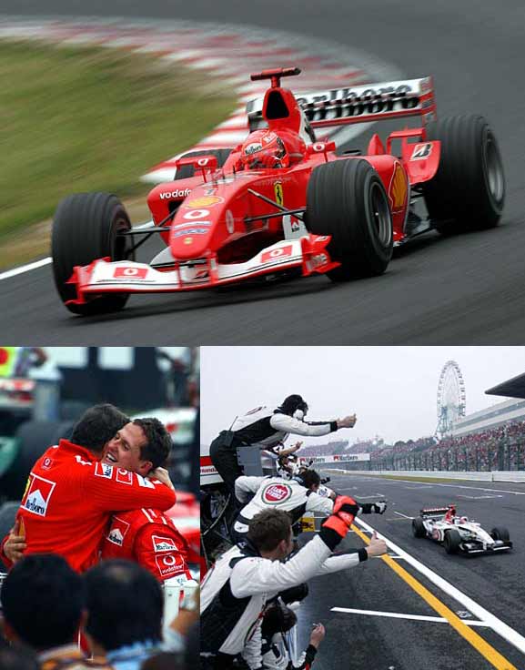 各チーム各ドライバーの様々な思惑が飛び交う、2003年最終戦鈴鹿。 風雲急を告げるとは当にこのことで、週末の天候は崩れ気味。 春のMotoGP、夏の8耐、そして秋のF1と、年3回も鈴鹿に行くのはどうかと思われたので、 今回はTV観戦でしたが(案の定夜勤明けでしんどかったし)、 昨年に続いて鈴鹿を沸かせた琢磨の走りは、現地では見ごたえあったことでしょう。 (私が日本GPを見に行った'94〜'99年は、ただの一度も日本人が入賞しなかったので)