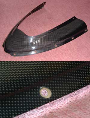 で、最終的には一番完璧な手段、「穴を一旦FRPで塞いで開けなおす」という基本に戻って、やってみました。 樹脂は最後に残ったビニルエステルを使いましたが、繊維はことさらカーボンを使う必要のある場所でもないので、フツーにガラス繊維のロービングを樹脂で固めました。 で、塞いでから6.5oのドリルで穴を開けなおし、そこにウェルナットを仕込みました。完璧です。もう外れません。