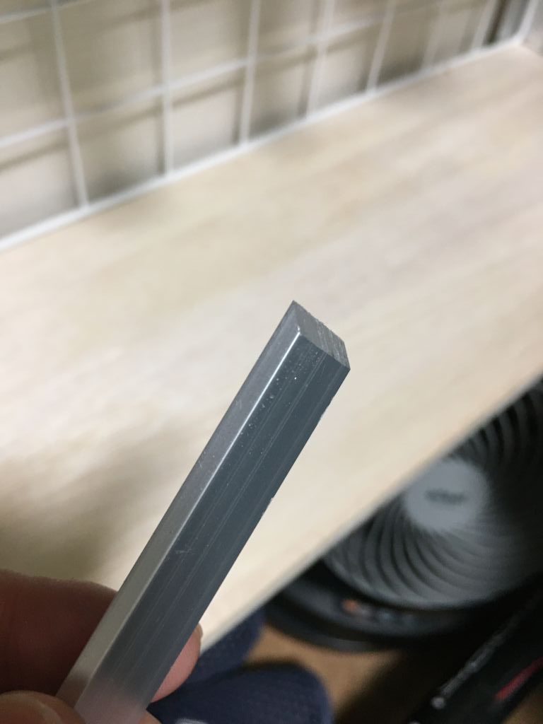 さて回路設計は完成しましたが、外装パーツがまだまだです。 ベゼル用に3o厚のアルミ平板を買ってきましたが、角の部分は正確に45度にカットしないとぴったり合わないため、フリーハンドでは難しい。 が、金属の精密切削工具は高いし、たった8か所の45度切断くらいなら治具を作ればフリーハンドでもなんとかなりそうと思い、せっかく買った3Dプリンタで治具も印刷しました。 3o平板がピッタリ入って動かないスリットに45度のレザーソー用スリットの付いた治具と、切断後に正確に45度でヤスリを当てられる治具。