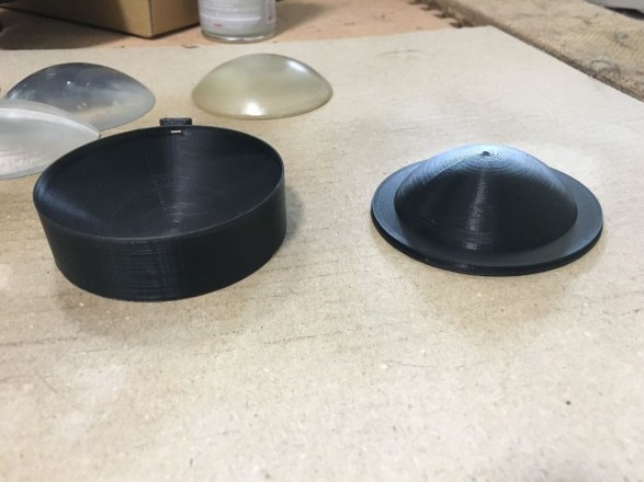 この画像では凹レンズ4枚に凸レンズ1枚の計5枚構成に見えます。(奥にもっとあるようにも) さすがにこれを全部再現することはできないので、やはり完全再現ではなくそれっぽいカンジで作るしかない。 しかしただのドームパーツではレンズの歪みがなくてそれっぽく見えないので、なにがしかのレンズは必要。 ということで、まずは一番上のメインレンズだけは断面図と同様の凹レンズということで、型枠を作ることにしました。 エポキシレジンで作るならシリコン型とかになりますが、シリコン型による複製自体も未経験だし、せっかく3Dプリンタがあるので型枠を印刷してみました。