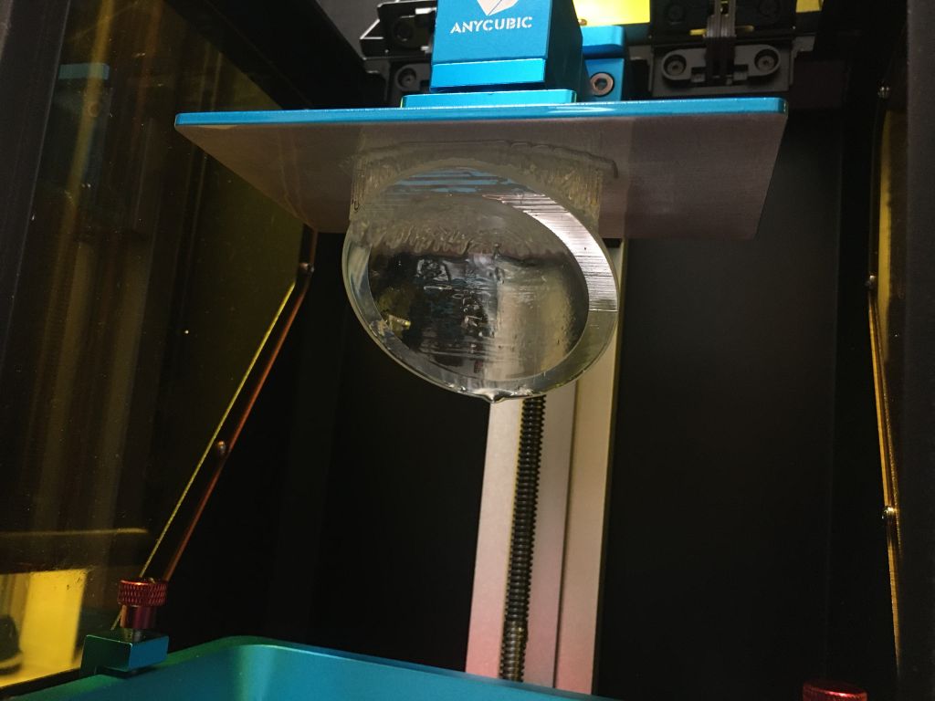 さあ、たかがHALのDIYのために何だか分からない状況になってきました。 セットで買った透明樹脂でレンズの印刷を試みますが・・・光造形のプリンタはさらに印刷面積が狭いので、直径90mm程度のHALのレンズすら寝かせて印刷できない。 そうするとFDMとは逆に天面側に造形物が貼り付く光造形方式では、サポート材をしっかり作らないと落下の恐れがあり、案の定はじめは何度やっても落下して失敗しました。 色々工夫してようやくレンズの造形に成功しましたが、形状が崩れたりたまに気泡が入ったり(手流しよりははるかにマシだが)、結構苦労します。 あまつさえ、造形したパーツを見てみると、最初から樹脂が黄色い。(黄変ではなく) 500g2000円台の安物レジンだからかとも思いましたが、調べると倍の値段の純正樹脂やさらに高価格な高級樹脂でも完全透明はない模様。 なぜなのかは分からないが、とにかく3Dプリンタ用の透明樹脂は透明ではないことが分かりました。(業務用とかは知らないが) これでは今までのエポキシ樹脂の黄変の心配以前の問題で(成形直後はエポキシもUVレジンも完全透明です)、途方にくれましたがあることを思いつきました。 手流しで失敗したクラフトレジンなら完全透明なんだし、これも光造形プリンタの樹脂と同じUVレジンなんだから、どうにかすれば使えるんじゃないの?と。 試しにそのままプリンタのバットにクラフトレジンを流し込んでテスト造形してみると、粘度がかなり強すぎて下のフィルムが破れそう。 そして細かい造形はムリということが分かったものの、一応ちゃんとデータの形に固まっている。(標準よりUV照射時間を多くしました) では粘度を落としてやればもう少しスムーズに、且つ細かい造形もある程度は行けんじゃないのということで、アセトンで希釈したものを使ってみました。 行けるじゃん!