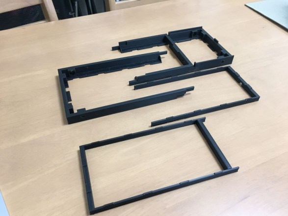 そもそもの本体フレームは当初5o厚の発泡プラ素材(何たらフォーム)で枠組を作ってみましたが、精密作業が超下手糞な自分には歪んだフレームしか作れない・・・ 結局これも正確に90度が出せる3Dプリンタで。 ただし、購入した3Dプリンタは以前よりは大きいものが印刷できるといえ、200mm四方程度が精一杯で300mmを超えるフレームは一発で作れないので、4分割方式です。 2分割ではなく4分割なのは、背面間接照明スペースのことと元キットよりアルミベゼルの厚みを薄く見せたいために2段構成にしたから。 映画のHALのインターフェイスは壁に埋まっていますが、実際に壁に埋め込むわけにはいかないので、映画同様薄く見せるにはこういう仕掛けが必要。