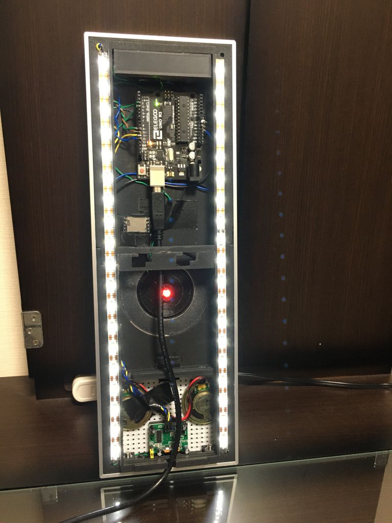 外装がほぼ完成したので、最後にArduino本体、DFPlayer Mini、人感センサー、各LEDライト、スピーカーを内部に配置し、配線を施し(一度目は配線が汚すぎたのでやり直し)、ついに完成しました。
