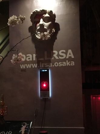 程良い明るさでLEDが光り、不気味な「目」も十分な再現度。 そして程良い感度で人を感知し、ボソボソしゃべる。 音量もちょうどよいレベルなので、ボリューム調整は不要なカンジ。 尚、もししゃべりすぎてやかましい時は、SDカードを抜いてしまえばしゃべらなくなる。 電源用に3mのUSBケーブルも用意し、壁掛け用フックも自作し(簡単に設置・装着できるけど触っただけでは落ちないレベルの)、オール完成。 そして昨日、実際にバーカウンターの奥に設置してきました。