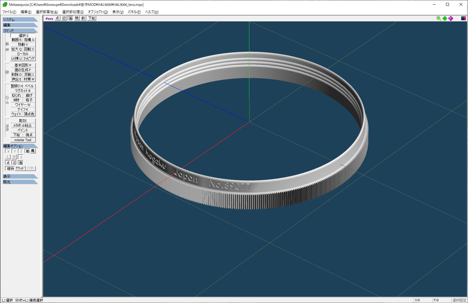 あと、後回しにしたフォーカスリングの文字入れですが、だいぶMetasequoiaの勘も取り戻してきたのと、メタセコで出来ないことをやるために以前から触るだけ触っていたAutodesk Fusionとかを駆使して、なんとか文字入れしたデータを作成。 印刷で再現されるか不安だったものの、FDM式のほうで印刷してみたら結構ちゃんと読めるものが出来ました。 ただ、白で墨入れすると文字が太くてオモチャっぽくなってしまったので、やはりこれも光造形で再印刷。 リング状で立てて印刷とかは歪む恐れがあるので、2分割で印刷したものを接着して使用。 ちゃんと接着面を工夫すればズレずに接着できたので、レンズを抑えるパーツとかも同じく光造形で。