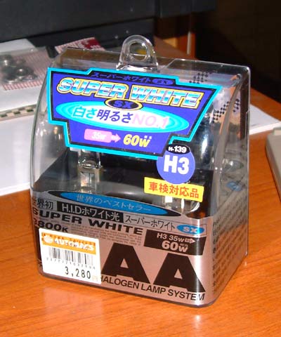 んで、どうしようかと考えていたら、 F4のローバルブがH3タイプで、四輪用がそのまま使えるという話を聞き、早速オートバックスで一番安いのを買ってきたわけです。 四輪用だけに2個セットしかなかったけど。 でもまあ、予備に置いとく手もあるし、アプリリアにも使えるかも。 (アプリリアはローがH1、ハイがH3でした) で、早速付けてみると、確かに白いのですが、横で光っているポジションランプが黄色くて、ちょっと濁ってしまう。うーむ、しかしこれはさすがに白く出来んし、 しょうがないか。 (<後日談:Pランプは青いLEDに変えました)