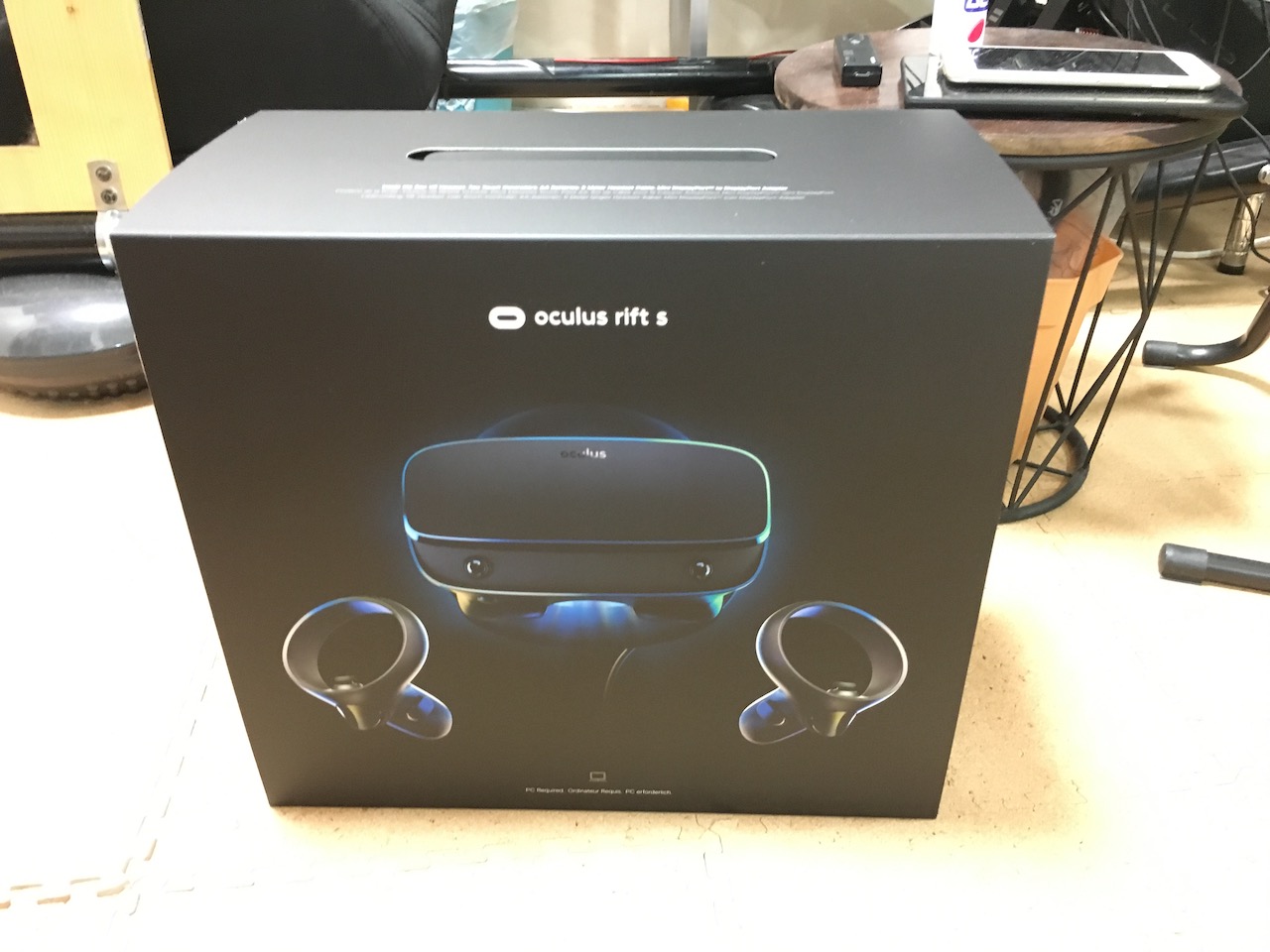 やたら豪華すぎたCV1の梱包に比べれば、だいぶ簡素になったものの、十分なRift S。(まあ梱包なぞ開けてしまえばどうでも良いが) 外部カメラがないので、HMDと専用コントローラだけとなり、ずいぶんスッキリしました。 同じOculusなので、PCのソフトはそのまま利用できるため、PC起動してHMDのケーブル(USB3.0+DisplayPort)を繋ぐだけでセットアップが始まり、HMDとコントローラのファームウェアアップデートをしたら、使用できるようになりました。