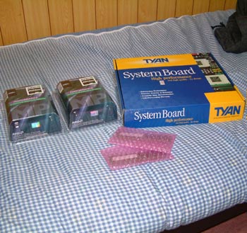 今回のマシンはAthlonMP2000+(1.67GHz駆動)と AMD760MPXチップのTYANマザーS2466。 しかも、メモリも今までのPC100SDRAMは使えず、 DDR SDRAMしか対応してないので、PC2100512MBを2枚挿し。