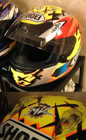 | | ヒマなので、ヘルメットの写真でも撮ってみました・・・ 型はSHOEIのX8-SP・・・だっけ? 違うかな? なんしか、バイク買うときにディーラーで貰ったヤツです。 カラーは派手なのにしよう、と思って WGP250ccクラスでアプリリアを2000年チャンピオンに導いた、 「ロベルト・ロカテッリ」レプリカです。 コレでアプリリアに乗ると似合うのですが、 MVアグスタで違和感が出ないように、 自作のステッカーを額に貼りました。 最初はイラストレータで一生懸命ベジェを引いて ギアマークを作ったんですが、その後ネットで純正(笑)の ベクトルデータを手に入れたので、それを使用しているので、 このステッカーは「純正」です(笑)