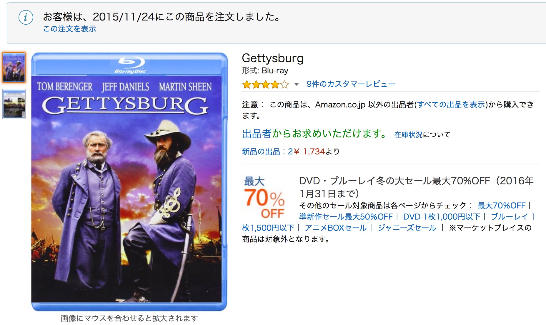 DVD版は日本では手に入らず、E-bayかどっかで個人輸入したというのに、探してみるとブルーレイ版は日本のAmazonで売っている。しかも1000〜2000円で現地価格と変わらない。 発売はどうやら2011年、今から4年前。 自分がDVDを買ったのが2010年だから、1年後にBD版出てたのかよ! www もちろんBD版も日本法人ではなく海外からの輸入盤ですが、幸い日本とアメリカはBDでは同じリージョンなので、同じプレイヤーで再生可能。 ということで、「ゲティスバーグの戦い」本編と、DVD版でセットになっていたシリーズ第2弾「GODS AND GENERALS」の両方をAmazonで買うことにしました。
